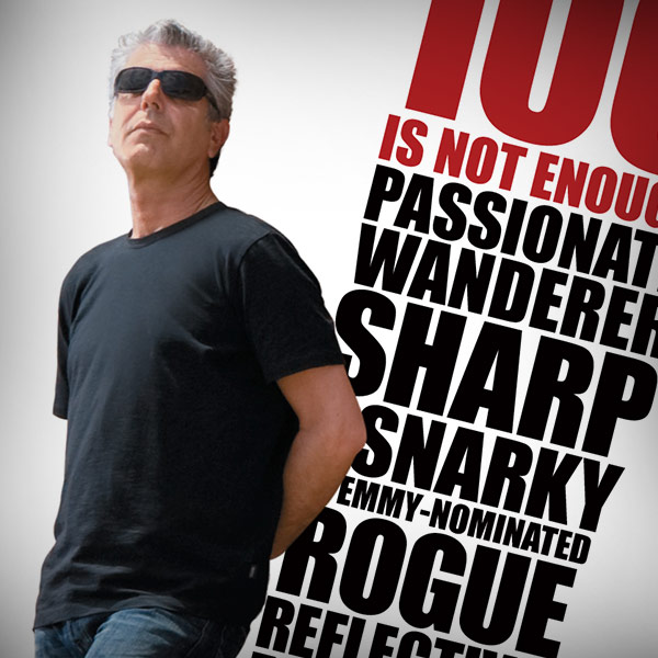 There are a lot of ways to describe Anthony Bourdain. He's a complex dude. Taking some of those adjectives and nouns and combining it with his love of all things sharp (his autograph even includes a knife), I designed this ad to promote Tony’s 100th No Reservations episode. The ad was run as a national campaign in The New Yorker, Entertainment Weekly, the New York Times, USA Today, the Daily News, Newsday, and various cable industry publications. The advertising helped play a big part in the episode being the highest-rated of the season and up 26% over the season average.